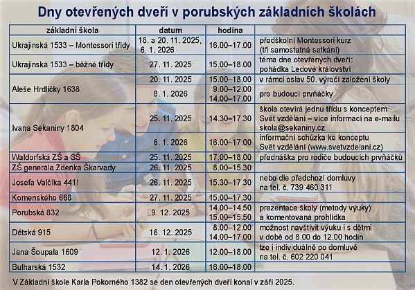 Budoucí prvňáčci s rodiči si mohou do konce roku prohlédnout své budoucí školy během tradičních dnů otevřených dveří. Školy pro ně připravily nejrůznější program, v některých bude možné navštívit i výuku nebo si prohlédnout školu individuálně.